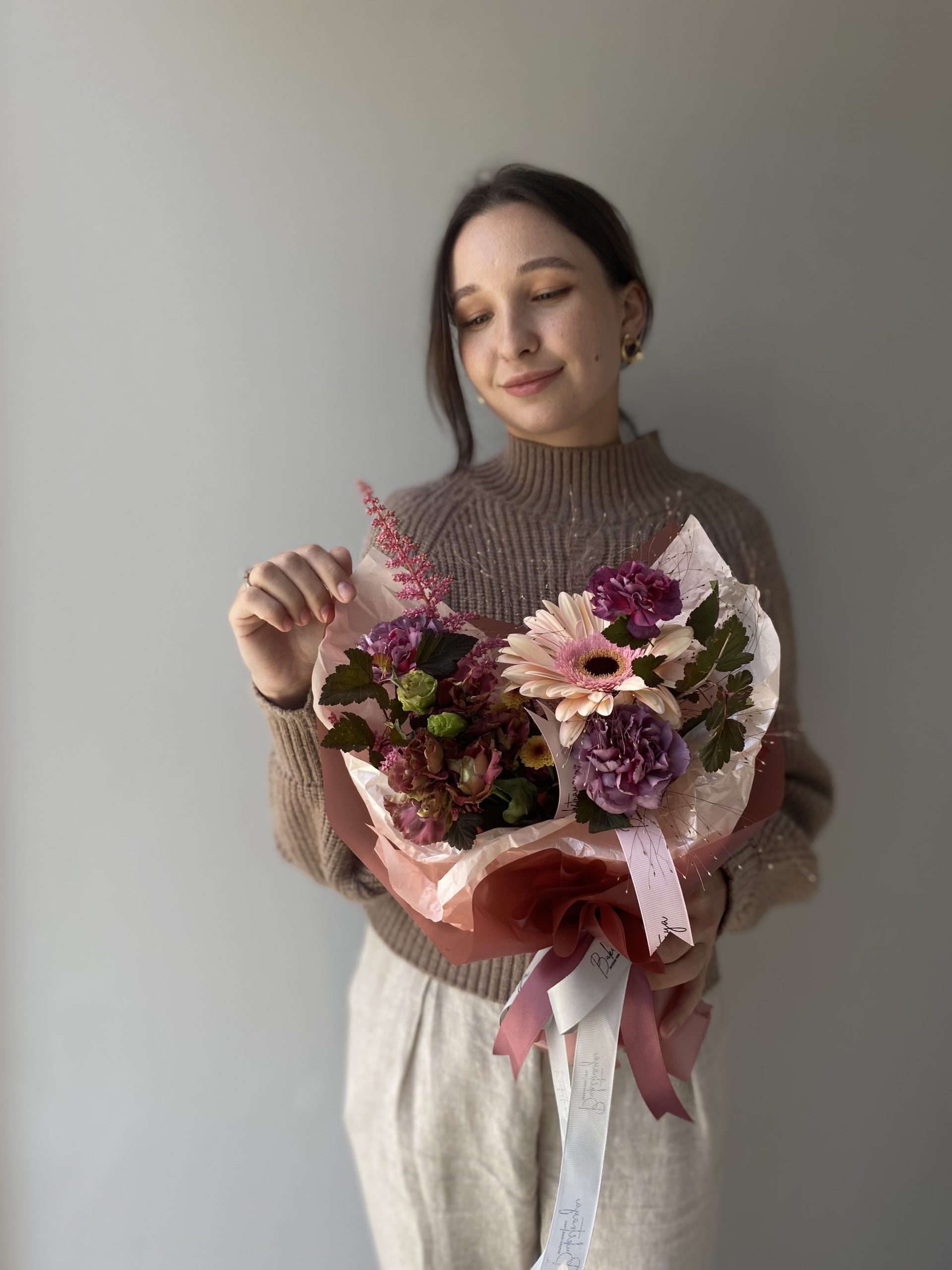 Насыщенный, выразительный букет в тёмно-бордовой гамме, передающий атмосферу вечернего заката и страсти.